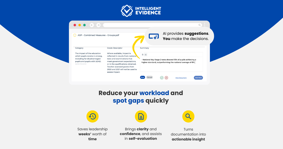Transform your school's evidence management with Intelligent Evidence - automated mapping to Ofsted requirements. Streamline inspections, save time, and ensure compliance with our smart educational evidence platform.