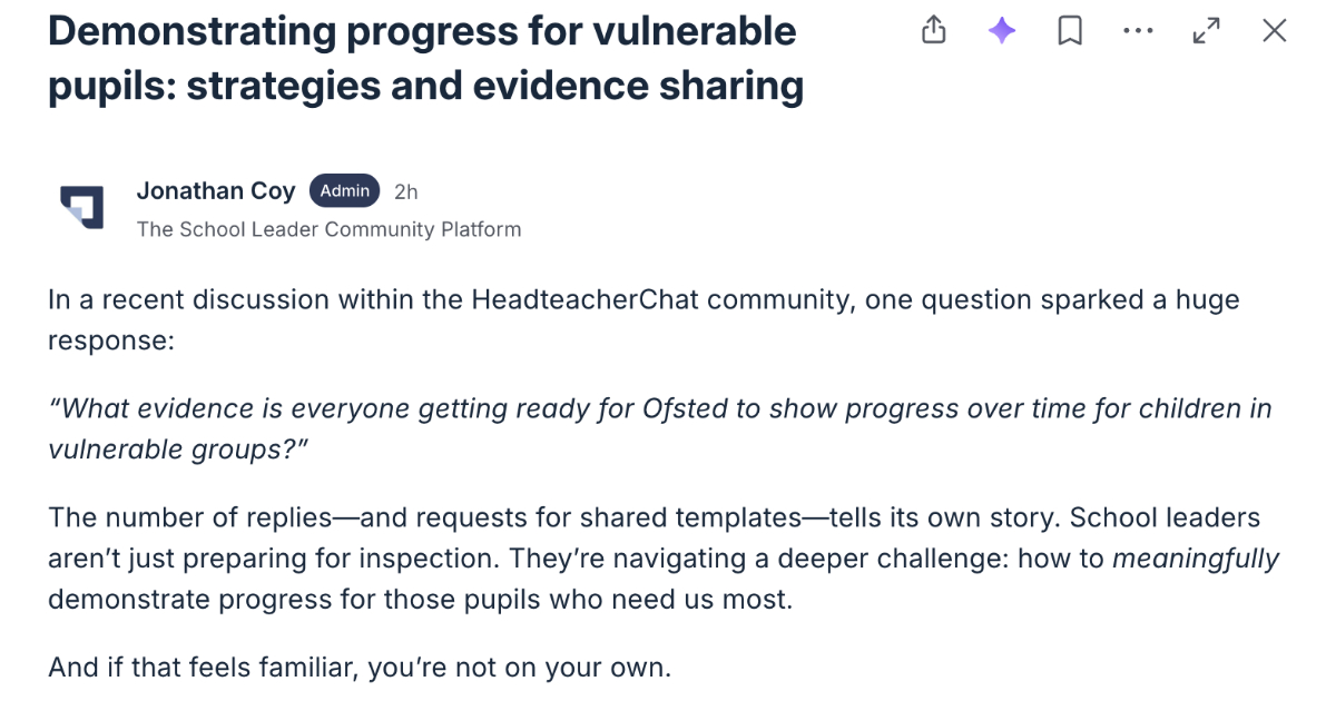 Join headteachers discussing evidence and support strategies for vulnerable pupils. Share insights, best practices and solutions in our education community forum dedicated to improving outcomes for at-risk students.